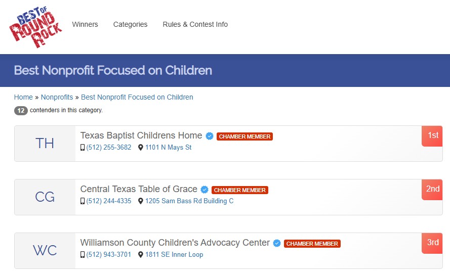 Central Texas Table of Grace has once again been recognized among the top nonprofits serving children by Best of Round Rock. For the second consecutive year, CTTG earned a Top 3 ranking in the “Best Nonprofit Focused on Children” category, moving up from #3 in 2024 to #2 in 2025!